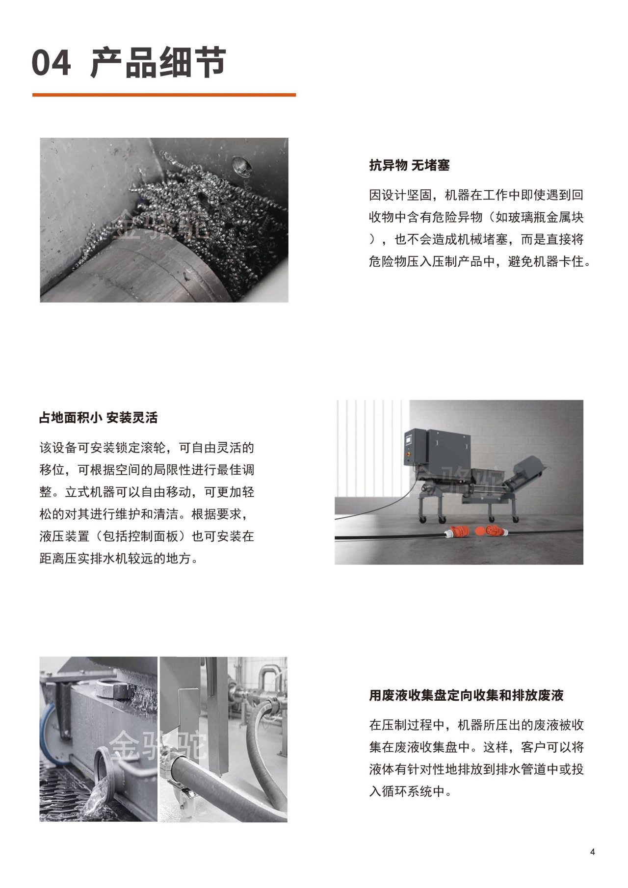 1、將待回收物壓制成型,有效減少儲(chǔ)存所占空間及顯著提高轉(zhuǎn)售價(jià)值;